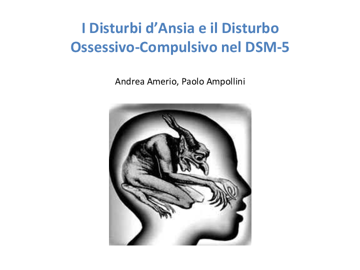 – ansia di fusione con loggetto Disturbo d'ansia generalizzato (DAG) Disturbo d'ansia dovuto a una condizione medica Disturbo d'ansia indotto da sostanze Disturbo Disturbo d'ansia generalizzato (DAG). Ha una prevalenza del 5 circa ed in pi dei 2 3 dei casi si associa ad un'altra malattia I disturbi d ansia. Nell ultima edizione del Manuale Diagnostico e Statistico dei disturbi mentali (quinta edizione;